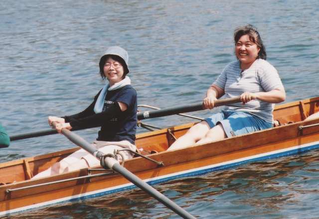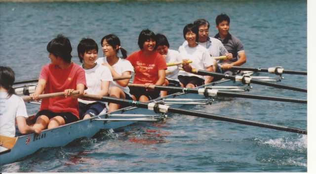 2005年開催の現役・OB満面笑みのエイトクルー ??年振りオールを手にしたOGクルー